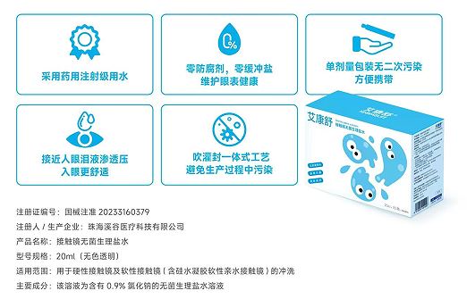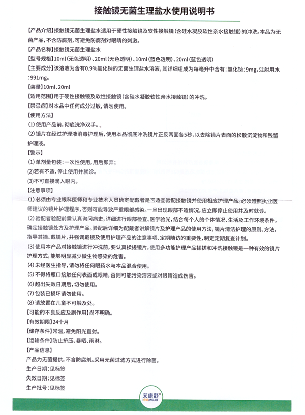| 隐形眼镜商品名称 | 艾康舒接触镜无菌生理盐水(20ml*30) |