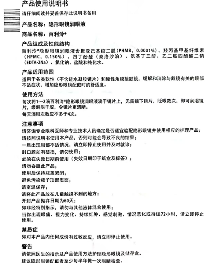 | 隐形眼镜商品名称 | 博士伦百利泠隐形眼镜润眼液(15ml) |